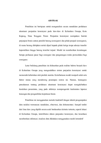 Penelitian ini bertujuan untuk menganalisis secara mendalam perlakuan akuntansi penjualan konsinyasi pada kios-kios di Kelurahan Oesapa, Kota Kupang, Nusa Tenggara Timur. Penjualan konsinyasi merupakan bentuk perjanjian bisnis antara pemilik barang (consignor) dan pihak penjual (consignee), di mana barang dititipkan untuk dijual kepada pihak ketiga tanpa adanya transfer kepemilikan hingga barang tersebut terjual. Model ini memberikan keuntungan berupa perluasan pasar bagi consignor dan pengurangan risiko permodalan bagi consignee. Latar belakang penelitian ini didasarkan pada realitas bahwa banyak kios di Kelurahan Oesapa yang mengandalkan sistem penjualan konsinyasi untuk memenuhi kebutuhan stok produk mereka. Keterbatasan modal menjadi salah satu faktor utama yang mendorong penerapan sistem ini. Namun, kurangnya pemahaman tentang perlakuan akuntansi konsinyasi dapat mengakibatkan kesalahan pencatatan, yang pada akhirnya mempengaruhi keakuratan laporan keuangan dan pengambilan keputusan bisnis. Penelitian ini menggunakan metode kualitatif dengan teknik pengumpulan data melalui wawancara mendalam, observasi, dan dokumentasi. Sampel terdiri dari lima kios yang dipilih secara acak berdasarkan kriteria tertentu, seperti lokasi di Kelurahan Oesapa, keterlibatan dalam penjualan konsinyasi, dan kesediaan memberikan informasi. Analisis data dilakukan menggunakan model interaktif Miles dan Huberman yang meliputi reduksi data, penyajian data, dan penarikan kesimpulan. Hasil penelitian menunjukkan bahwa sebagian besar kios telah memisahkan pencatatan penjualan konsinyasi dari penjualan reguler. Pemisahan ini dilakukan baik secara manual menggunakan buku catatan terpisah maupun dengan pemberian kode khusus pada barang konsinyasi. Pengakuan pendapatan umumnya dilakukan pada saat barang terjual dan pembayaran diterima dari pihak consignor. Tantangan yang dihadapi meliputi ketidakpastian waktu penjualan, pengelolaan stok yang memerlukan ketelitian tinggi, serta kebutuhan akan pencatatan yang akurat dan terstandarisasi. Temuan penelitian juga mengidentifikasi bahwa komunikasi yang baik antara consignor dan consignee menjadi kunci keberhasilan dalam penerapan sistem konsinyasi. Kesalahan dalam pencatatan atau keterlambatan pelaporan dapat mempengaruhi transparansi dan kepercayaan antara kedua pihak. Selain itu, adanya persaingan antara barang konsinyasi dan barang milik sendiri menuntut adanya strategi penjualan yang tepat agar tidak terjadi kanibalisasi penjualan. Kesimpulan penelitian ini adalah bahwa penerapan perlakuan akuntansi penjualan konsinyasi yang baik memerlukan: (1) pemisahan yang jelas antara pencatatan barang konsinyasi dan barang milik sendiri, (2) prosedur pengakuan pendapatan yang sesuai dengan PSAK 72, (3) sistem pelaporan yang tepat waktu dan akurat, serta (4) komunikasi dan koordinasi yang efektif antara pihak consignor dan consignee. Penelitian ini diharapkan dapat menjadi acuan praktis bagi pelaku UMKM, khususnya pemilik kios, dalam meningkatkan akuntabilitas dan transparansi laporan keuangan mereka. Penelitian ini juga memberikan kontribusi akademis berupa pengayaan literatur terkait praktik akuntansi penjualan konsinyasi dalam konteks usaha kecil di daerah perkotaan. Dengan memahami karakteristik lokal, hasil penelitian ini relevan untuk dikembangkan lebih lanjut pada penelitian-penelitian berikutnya. Selain itu, implikasi praktis dari penelitian ini dapat membantu pelaku usaha dalam merancang sistem pencatatan yang sederhana namun efektif, sehingga meminimalisir risiko kesalahan dan meningkatkan efisiensi pengelolaan usaha. Diharapkan penelitian ini mampu mendorong kesadaran pelaku UMKM akan pentingnya pencatatan keuangan yang sesuai standar, terutama dalam transaksi penjualan konsinyasi.