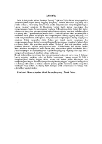 Rumusan Masalahan yang dikaji oleh penulis adalah 1) Faktor yang menyebabkan pelaku menyimpan dan memperniagakan bagian burung enggang/rangkong, 2) Bagaimana bentuk tindak pidana menyimpan dan memperniagakan bagian burung enggang/ rangkong 3) Bagaimana akibat hukum dari tindak pidana menyimpan dan memperniagakan bagian burung enggang/rangkong terhadap pelaku dan barang bukti. Tujuan Penelitian penulis adalah: Untuk mengetahui faktor penyebab pelaku melakukan tindak pidana menyimpan dan memperniagakan burung enggang/rangkong, dan Untuk mengetahui bentuk tindak pidana menyimpan dan memperniagakan burung enggang/dan rangkong, Untuk mengetahui akibat hukum dari tindak pidana menyimpan dan memperniagakan bagian dari satwa yang di lindungi burung enggan/ranggkok terhadap pelaku dan barang bukti. Sifat penelitian penulis adalah “Deskriptif” dan Jenis penelitian adalah penelitian normative. Variable yang digunakan yaitu: Variabel bebas dan Variabel Terikat Hasil penelitian menunjukkan bahwa: Faktor yang menyebabkan pelaku melakukan tindak pidana menyimpan dan memperniagakan bagian burung enggang/rangkong adalah 1) a. untuk memperoleh keuntungan. b. dijadikan sebagai perhiasaan Bentuk tindak pidana menyimpan dan memperniagakan bagian dari satwa yang di lindungi burung enggang/rangkong yaitu: a) Pelaku menyimpan burung enggan b) Pelaku memperniagakan burung enggan akibat hukum dari tindak pidana menyimpan dan memperniagakan bagian dari satwa yang di lindungi burung enggan/ranggkok terhadap pelaku dan barang bukti yaitu: a) Pelaku dipidana penjara, pelaku membayar denda dan pelaku membayar biaya perkara. b) Barang bukti dirampas untuk dimusnakan dan barang bukti dikmbalikan kepada terdakwa