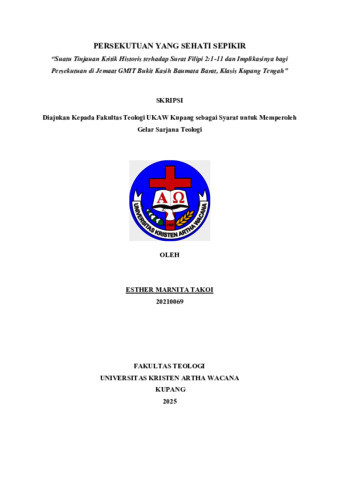 TAKOI, Esther Marnita (2025) PERSEKUTUAN YANG SEHATI SEPIKIR: Suatu Tinjauan Kritik Historis terhadap Surat Filipi 2:1-11 dan Implikasinya bagi Persekutuan di Jemaat GMIT Bukit Kasih Baumata Barat, Klasis Kupang Tengah. Undergraduate thesis, Artha Wacana Christian University.