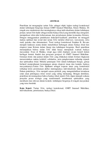 Penelitian ini mengangkat tarian Tebe sebagai objek kajian teologi kontekstual dalam kehidupan bergereja Jemaat GMIT Imanuel Maktihan, Klasis Malaka. Di tengah arus modernisasi dan meningkatnya sikap individualisme dalam kehidupan jemaat, tarian Tebe hadir sebagai media budaya lokal yang memiliki daya integratif, memperkuat nilai-nilai kebersamaan dan persekutuan dalam komunitas Kristen. Dengan menggunakan pendekatan deskriptif-kualitatif, penelitian ini menggali makna spiritual dan sosial dari tarian Tebe melalui observasi, wawancara, serta studi pustaka dan dokumentasi. Teori teologi kontekstual Stephen B. Bevans menjadi landasan utama dalam menafsirkan hubungan antara budaya lokal dan ekspresi iman Kristen dalam liturgi dan kehidupan bergereja. Hasil penelitian menunjukkan bahwa tarian Tebe tidak hanya merupakan warisan budaya masyarakat Tetun di Malaka, tetapi juga telah diadopsi secara kreatif dalam berbagai bentuk ibadah dan perayaan gerejawi di GMIT Imanuel Maktihan. Gerakan ritmis dan pantun dalam Tebe yang dilakukan dalam formasi lingkaran mencerminkan makna kolektif, solidaritas, serta penghormatan terhadap sejarah dan spiritualitas lokal. Melalui penerapan Tebe dalam kehidupan liturgis, gereja berhasil menjembatani kesenjangan antara ekspresi iman dan konteks budaya masyarakatnya.Tarian Tebe dipahami sebagai respons iman yang kontekstual terhadap krisis persekutuan akibat meningkatnya individualisme dalam jemaat. Dalam praktiknya, Tebe menjadi sarana profetik yang mengembalikan kesadaran umat akan pentingnya relasi sosial yang saling menopang. Dengan demikian, penelitian ini menegaskan bahwa budaya lokal seperti Tebe dapat menjadi wahana penyalur pesan teologis yang transformatif, membentuk spiritualitas yang membumi dan relevan dalam konteks kehidupan bergereja di tengah masyarakat yang terus berubah.