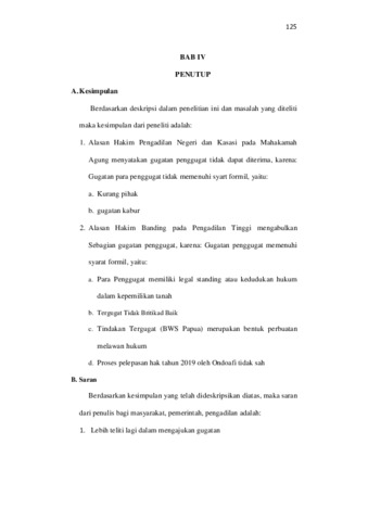 Rumusan masalah yang penulis teliti adalah: 1. Mengapa Hakim Pengadilan Negeri dan Kasasi pada Mahakamah Agung menyatakan gugatan penggugat tidak dapat diterima?, 2. Mengapa Hakim Banding pada Pengadilan Tinggi mengabulkan Sebagian gugatan penggugat?. Tujuan penelitian ini adalah: 1. Untuk mengetahui alasan Hakim Pengadilan Negeri dan Kasasi pada Mahakamah Agung menyatakan gugatan penggugat tidak dapat diterima, 2. Untuk mengetahui Hakim Banding pada Pengadilan Tinggi mengabulkan Sebagian gugatan penggugat. Jenis penelitian hukum yang digunakan adalah penelitian normatif yang meliputi penelitian terhadap asas hukum, penelitian terhadap, sistematika hukum, yang bersifat mendeskripsikan, menggambarkan suatu peristiwa yang sejelas mungkin terkait dengan rumusan masalah di atas. Variabel bebas dalam penelitia ini adalah: 1. alasan Hakim Pengadilan Negeri dan Kasasi pada Mahakamah Agung menyatakan Gugatan Penggugat tidak dapat diterima, 2. Alasan Hakim Banding pada Pengadilan Tinggi mengabulkan sebagian gugatan Dalam Sengketa Penguasaan Tanah Oleh Pemerintah. Variabel terikat dalam penelitian ini adalah Putusan hakim dalam Sengketa Penguasaan Tanah Oleh Pemerintah. Berdasarkan Hasil penelitian yang penulis lakukan, maka yang menjadi kesimpulan dimana penulis menemukan sesuai dengan permasalahan yang sudah penulis uraikan diatas adalah:1. alasan Hakim Pengadilan Negeri dan Kasasi pada Mahakamah Agung menyatakan Gugatan Penggugat tidak dapat diterima, karena: Gugatan para penggugat tidak memenuhi syarat formil, yaitu: Kurang pihak dan Gugatan kabur, 2. Alasan Hakim Banding pada Pengadilan Tinggi mengabulkan sebagian gugatan Dalam Sengketa Penguasaan Tanah Oleh Pemerintah, karena Gugatan penggugat memenuhi syarat formil, yaitu: Tindakan Tergugat (BWS Papua) merupakan bentuk perbuatan melawan hukum,tergugat tidak beritikad baik, para penggugat memiliki legal standing atau kedudukan hukum dalam kepemilikan tana, dan proses pelepasan hak tahun 2019 oleh Ondoafi tidak sah. Berdasarkan kesimpulan yang telah dideskripsikan diatas, maka Paran dari penulis bagi masyarakat, pemerintah, dah Pengadilan adalah:1. pemerintah harus mematuhi prosedur hukum, termasuk melakukan ganti rugi secara adil dan transparan kepada pemilik tanah, 2. Masyarakat harus lebih jelas dalam mengajukan sebuah gugatan supaya tidak ada kekeliruan dikemudian hari, 3. Pengadilan harus tegas dalam menyelesaikan perkara perbuatan melawan hukum supaya adil dan tidak membawa kerugian bagi orang lain.