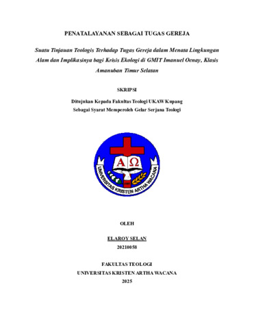 SELAN, Elaroy (2025) PENATALAYANAN SEBAGAI TUGAS GEREJA: Suatu Tinjauan Teologis Terhadap Tugas Gereja dalam Menata Lingkungan Alam dan Implikasinya bagi Krisis Ekologi di GMIT Imanuel Oenay, Klasis Amanuban Timur Selatan. Undergraduate thesis, Artha Wacana Christian University.