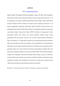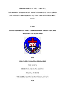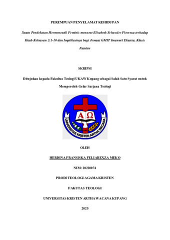 ABSTRAK Email: welempally@gmail.com Skripsi berjudul “Perempuan Penyelamat Kehidupan” dengan sub judul “Suatu Pendekatan Hermeneutik Feminis menurut Elisabeth Schussler Fiorenza terhadap Kitab Keluaran 2:1-10 dan Implikasinya bagi Jemaat GMIT Imanuel Ekateta, Klasis Fatuleu” ditulis oleh Herdina Fransiska Feliarekxza Meko. Penelitian ini bertujuan untuk mengkaji teks Keluaran 2:1-10 dengan menggunakan pendekatan hermeneutik feminis Elisabeth Schussler Fiorenza dan diimplikasikan bagi Jemaat GMIT Imanuel Ekateta yang berhadapan dengan para perempuan yang bekerja sebagai Tenaga Kerja Wanita (TKW). Penelitian ini menggunakan metode hermeneutik feminis oleh Fiorenza dan metode penelitian kualitatif dengan teknik pengumpulan data studi pustaka, observasi, dan wawancara. Hasil penelitian menunjukkan bahwa teks Keluaran 2:1-10 dapat dibaca sebagai teks yang mempromosikan peran perempuan dalam misi penyelamatan Allah dan perempuan yang termarginalkan serta dianonimitaskan oleh budaya ternyata mampu melakukan hal-hal besar. Penelitian ini juga menemukan bahwa perempuan dalam teks tersebut berperan aktif dalam menyelamatkan kehidupan Musa dan bangsa Israel. Implikasi penelitian ini bagi Jemaat GMIT Imanuel Ekateta adalah pentingnya mengakui dan menghargai setiap peran perempuan dalam keluarga, gereja dan masyarakat, terutama dalam konteks patriarki yang masih kuat di Ekateta. Penelitian ini diharapkan dapat memberikan kontribusi pada pemahaman yang lebih luas tentang peran perempuan dalam Alkitab dan menanamkannya bagi kehidupan gereja dan masyarakat. Kata kunci : Hermeneutik Feminis, Keluaran, Perempuan, Anonimitas, Penyelamat.