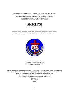 BANAMTUAN, Andro T. (2025) PELAKSANAAN KETEPATAN SMASH PEMAIN BOLA VOLI SISWA SMA NEGERI 9 KELAS XI DITINJAU DARI KOORDINASI MATA DAN TANGAN. Undergraduate thesis, Artha Wacana Christian University.