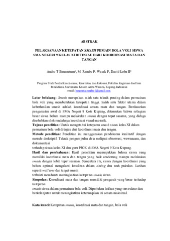 Latar belakang: Smash merupakan salah satu teknik penting dalam permainan bola voli yang membutuhkan ketepatan tinggi. Salah satu faktor utama dalam keberhasilan smash adalah koordinasi antara mata dan tangan. Berdasarkan pengamatan awal di SMA Negeri 9 Kota Kupang, ditemukan bahwa sebagian besar siswa belum mampu melakukan smash dengan tepat sasaran, yang diduga disebabkan oleh rendahnya koordinasi visual-motorik. Tujuan penelitian: Untuk mengetahui ketepatan smash siswa kelas XI dalam permainan bola voli ditinjau dari koordinasi mata dan tangan. Metode penelitian: Penelitian ini menggunakan pendekatan kualitatif dengan metode deskriptif. Teknik pengumpulan data meliputi observasi, wawancara, dan dokumentasi terhadap siswa kelas XI dan guru PJOK di SMA Negeri 9 Kota Kupang. Hasil dan pembahasan: Hasil penelitian menunjukkan bahwa siswa yang memiliki koordinasi mata dan tangan yang baik cenderung mampu melakukan smash dengan lebih tepat sasaran. Sementara itu, siswa dengan koordinasi yang belum optimal mengalami kesulitan dalam timing dan arah pukulan. Latihan seperti wall toss dan target smash terbukti membantu meningkatkan ketepatan smash siswa. Simpulan: Koordinasi mata dan tangan memiliki pengaruh yang besar terhadap ketepatan smash siswa dalam permainan bola voli. Diperlukan latihan yang terstruktur dan berkelanjutan untuk meningkatkan keterampilan ini secara maksimal.