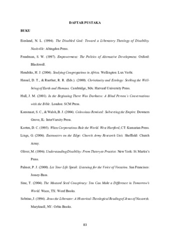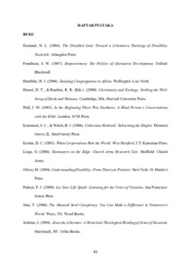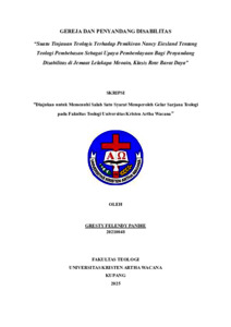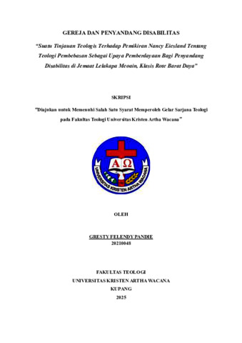 PANDHE, Gresty Felendy (2025) GEREJA DAN PENYANDANG DISABILITAS: Suatu Tinjauan Teologis Terhadap Pemikiran Nancy Eiesland Tentang Teologi Pembebasan Sebagai Upaya Pemberdayaan Bagi Penyandang Disabilitas di Jemaat Lelakapa Meoain, Klasis Rote Barat Daya. Undergraduate thesis, Artha Wacana Christian University.