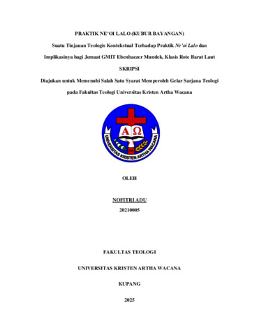 ADU, Nofitri (2025) PRAKTIK NE’OI LALO (KUBUR BAYANGAN): Suatu Tinjauan Teologis Kontekstual Terhadap Praktik Ne’oi Lalo dan Implikasinya bagi Jemaat GMIT Ebenhaezer Mundek, Klasis Rote Barat Laut. Undergraduate thesis, Artha Wacana Christian University.