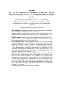 Latar Belakang: Pembelajaran merupakan bantuan yang diberikan pendidik agar dapat terjadi proses pemerolehan ilmu dan pengetahuan. Tujuan Penelitian: Untuk mengetahui upaya meningkatkan keterampilan pasing dalam permainan sepak bola pada siswa kelas V SD Inpres Sikumana 2 Kota Kupang. Metode Penelitian: Penelitian ini yang menggunakan teknik pegumpulan data PTK yang tercapai dari perencanaan, pelaksanaan, tindakan dan refleksi. Teknik analisis data menggunakan data presentasi hasil belajar siswa. Hasil dan pembahasan: Diketahui persentase siswa kelas V SD inpres sikumana 2 kota kupang yang tidak tuntas (nilai akhir tes 75 pada siklus 1 mencapai 25%) selanjutnya persentase tersebut mengalami peningkatan menjadi 100% pada siklus 2. Hal ini menjelaskan bahwa persentase siwa kelas V SD Inpres Sikumana 2 Kota Kupang. semakin meningkat setelah siswa di ajar ulang kali dan diberi kesempatan untuk melakukan gerakan tersebut secara berulang kali selama dua siklus. Hal tersebut dapat dilihat dari semakin meningkatnya persentase siswa yang tuntas dengan nilai akhir mencapai KKM. Simpulan: Berdasarkan hasil penelitian dan pembahasan yang telah diuraikan dapat ditemukan kesimpulan pola gerak dasar passing dalam permainan sepak bola siswa menunjukkan peningkatan yang signifikan, terlihat dari persentase ketuntasan yang mencapai 88,8% pada siklus II, siswa merasa senang dan bergerak bebas dalam mengikuti pembelajaran pola gerak dasar passing dalam permainan sepak bola. Dan guru sudah mampu menerapkan metode latihan dasar yang efektif pada siswa dalam meningkatkan pembelajaran pola gerak dasar passing dalam permainan sepak bola dalam pendidikan jasmanidi SD Inpres Sikumana 2 Kota Kupang.