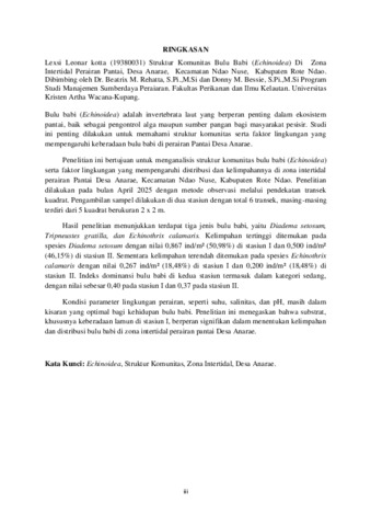 KOTTA, Lexis L. (2025) STRUKTUR KOMUNITAS BULU BABI (Echinoidea) DI ZONA INTERTIDAL PERAIRAN PANTAI, DESA ANARAE, KECAMATAN NDAO NUSE, KABUPATEN ROTE NDAO. Undergraduate thesis, Artha Wacana Christian University.