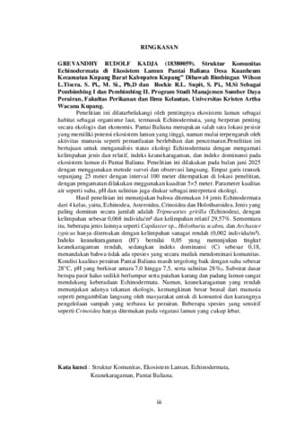 KADJA, Grevandhy Rudolf (2025) STRUKTUR KOMUNITAS ECHINODERMATA DI EKOSISTEM LAMUN PANTAI BALIANA DESA KUANHEUM KECAMATAN KUPANG BARAT KABUPATEN KUPANG. Undergraduate thesis, Artha Wacana Christian University.