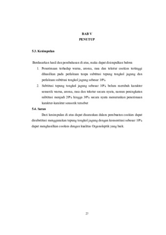 Cookies merupakan salah satu jenis biskuit yang di buat dari adonan lunak, berkadar lemak tinggi, relative renyah bila di patahkan dan penampang potongannya, bertekstur padat. Cookies yang terbuat dari tepung non-terigu biasanya termasuk kedalam golongan short dough. Cookies adalah kue yang terbuat dari bahan dasar yang pada umumnya dari tepung terigu, gula halus, telur ayam, vanili, margarine, baking powder, dan susu. Cookies mempunyai tekstur yang renyah dan tidak mudah hancur. Tujuan penelitian ini adalah untuk mengetahui pengaruh substitusi tepung tongkol jagung terhadap sifat sensorik cookies. Penelitian ini dilakukan pada bulan Maret 2025, dengan metode yang digunakan adalah Rancangan Acak Lengkap dengan 4 perlakuan yang diulang sebanyak 3 kali sehingga menghasilkan 12 unit percobaan yang dicoba dalam penelitian ini adalah substitusi tepung tongkol jagung sebanyak 0%, 10%, 20% dan 30%. Variabel yang diamati adalah karakteris sensorik cookies meliputi aroma, rasa, warna, dan tekstur.