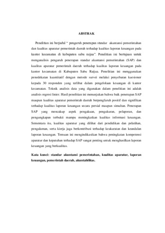 Penelitian ini berjudul “ pengaruh penerapan standar akuntansi pemerintahan dan kualitas aparatur pemerintah daerah terhadap kualitas laporan keuangan pada kantor kecamatan di kabupaten sabu raijua”. Penelitian ini bertujuan untuk menganalisis pengaruh penerapan standar akuntansi pemerintahan (SAP) dan kualitas aparatur pemerintah daerah terhadap kualitas laporan keuangan pada kantor kecamatan di Kabupaten Sabu Raijua. Penelitian ini menggunakan penedekatan kuantitatif dengan metode survei melalui penyebaran kuesioner kepada 30 responden yang terlibat dalam pengelolaan keuangan di kantor kecamatan. Teknik analisis data yang digunakan dalam penelitian ini adalah analisis regresi linier. Hasil penelitian ini menunjukan bahwa baik penerapan SAP maupun kualitas aparatur pemerintah daerah berpengfaruh positif dan signifikan terhadap kualitas laporan keuangan secara persial maupun simultan. Penerapan SAP yang mencakup aspek pengakuan, pengukuran, pelaporan, dan pengungkapan terbukti mampu meningkatkan kualitas informasi keuangan. Sementara itu, kualitas aparatur yang dilihat dari pendidikan dan pelatihan, pengalaman, serta kierja juga berkontribusi terhadap keakuratan dan keandalan laporan keuangan. Temuan ini mengindikasikan bahwa peningkatan kompetensi aparatur dan kepatuhan terhadap SAP sangat penting untuk menghasilkan laporan keuangan yang berkualitas.