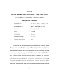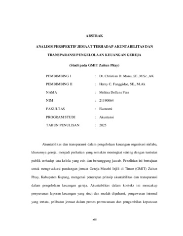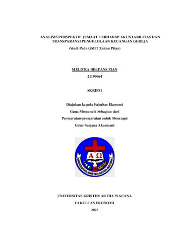 PIAN, Melitra Delfans (2025) ANALISIS PERSPEKTIF JEMAAT TERHADAP AKUNTABILITAS DAN TRANSPARANSI PENGELOLAAN KEUANGAN GEREJA (Studi Pada GMIT Zaitun Pitay). Undergraduate thesis, Artha Wacana Christian University.